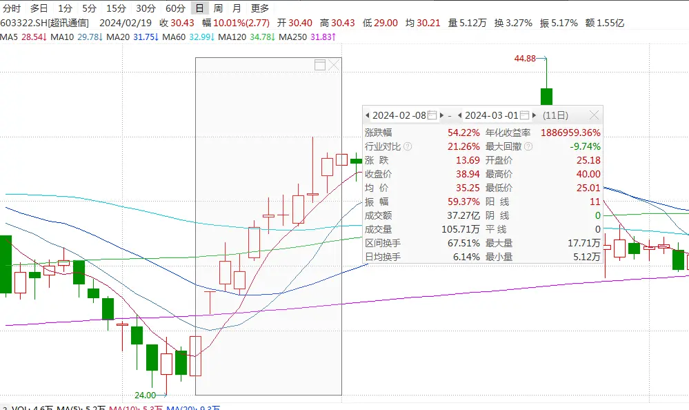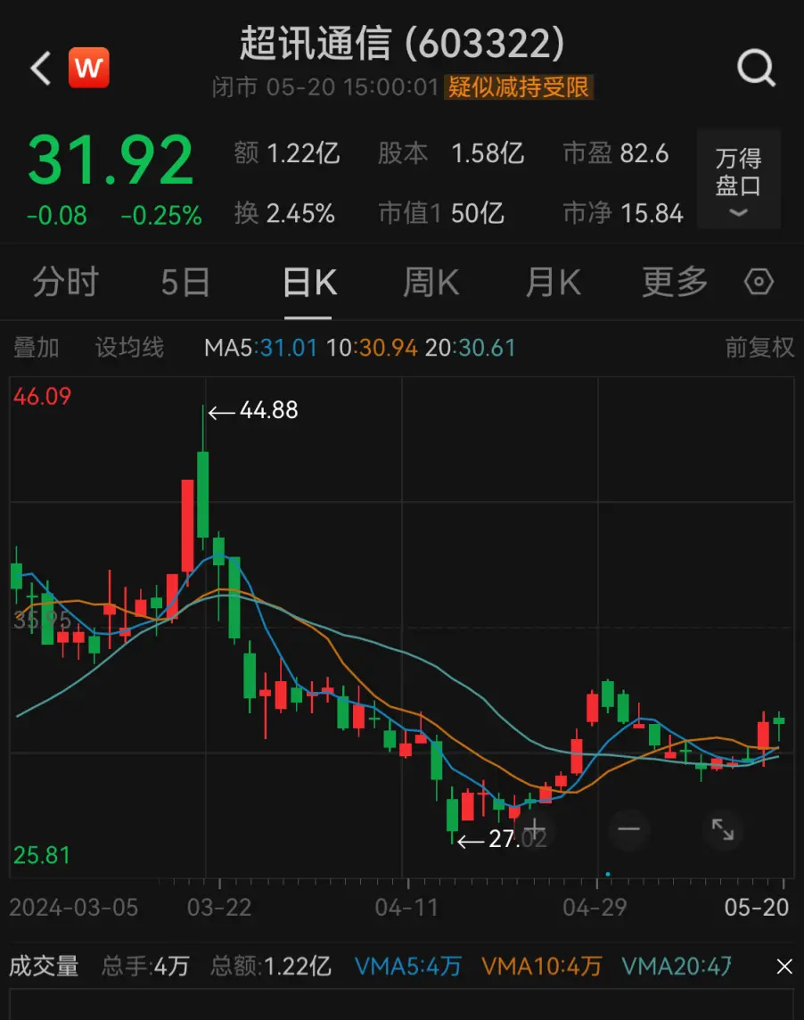 截至5月20日收盤,超訊通信每股報31.92元,與3月的高位相比下跌約24%。公司最新市值50億元。