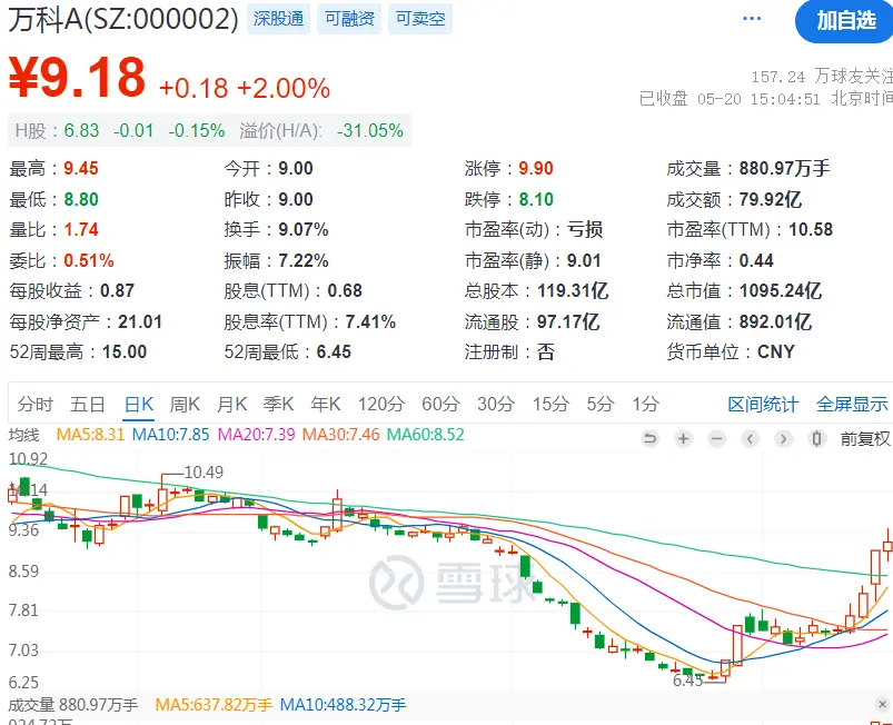 二級市場方面,萬科的股價已經(jīng)從低位反彈超40%!